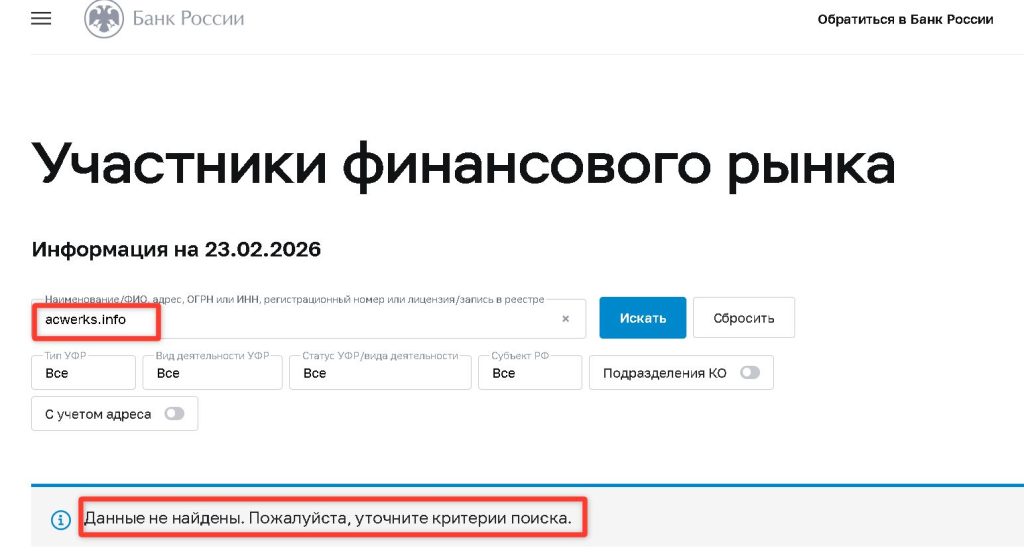 - Направьте обращения в Центральный банк РФ (ЦБ РФ) через интернет-приёмную. ЦБ РФ ведёт чёрный список нелегальных форекс-дилеров и финансовых пирамид. Ваша жалоба поможет включить Acwerks в этот список.