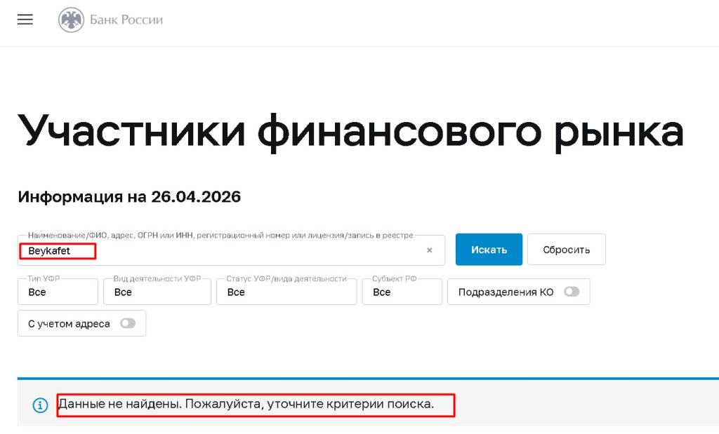 У Beykafet нет лицензии Центробанка России, нет и от зарубежных финансовых регуляторов .