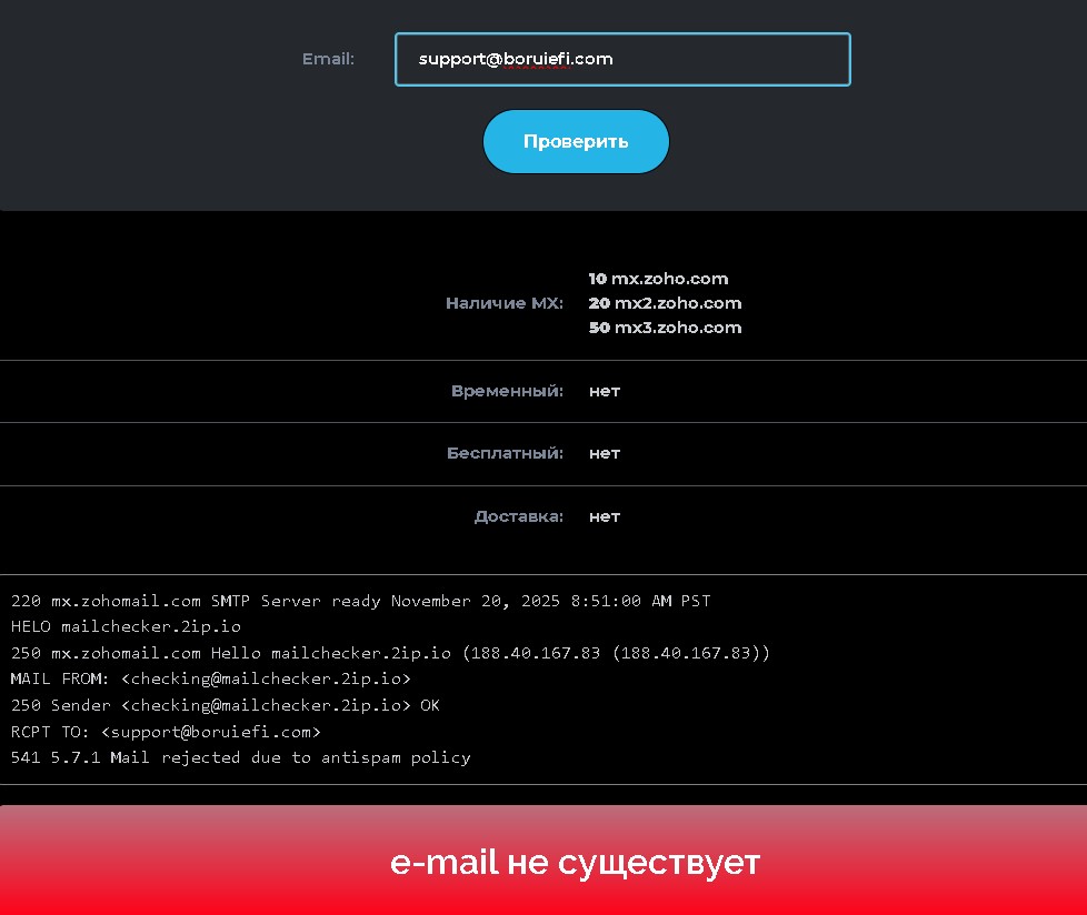 Электронная почта support@boruiefi.com не отвечает на запросы. Домен borui-efi.co вызывает особые подозрения — зона .co часто используется для создания фиктивных компаний-двойников.