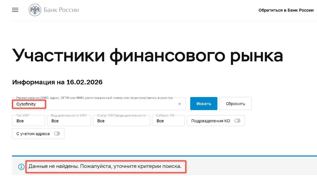 | Срок работы и история | Утверждается, что компания предоставляет услуги с 2018 года. | Домен cytofinity.net был зарегистрирован в 2021 году, а его владелец сменился в январе 2026 года. Домен cyto-finity.com создан совсем недавно — в декабре 2025 года. Это прямо указывает на «перезапуск» мошеннической схемы. |