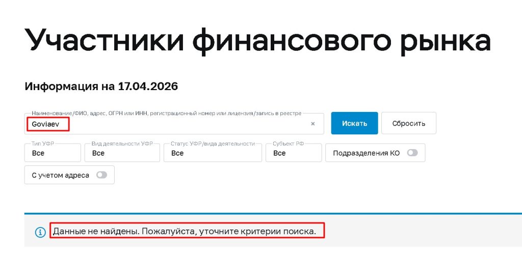Сайт Goviaev.com запустился в работу в январе 2026 года — это серьёзный признак компании-однодневки. Настоящие брокеры существуют годами и нарабатывают репутацию. У Goviaev нет лицензии Центробанка России, нет и от зарубежных финансовых регуляторов .