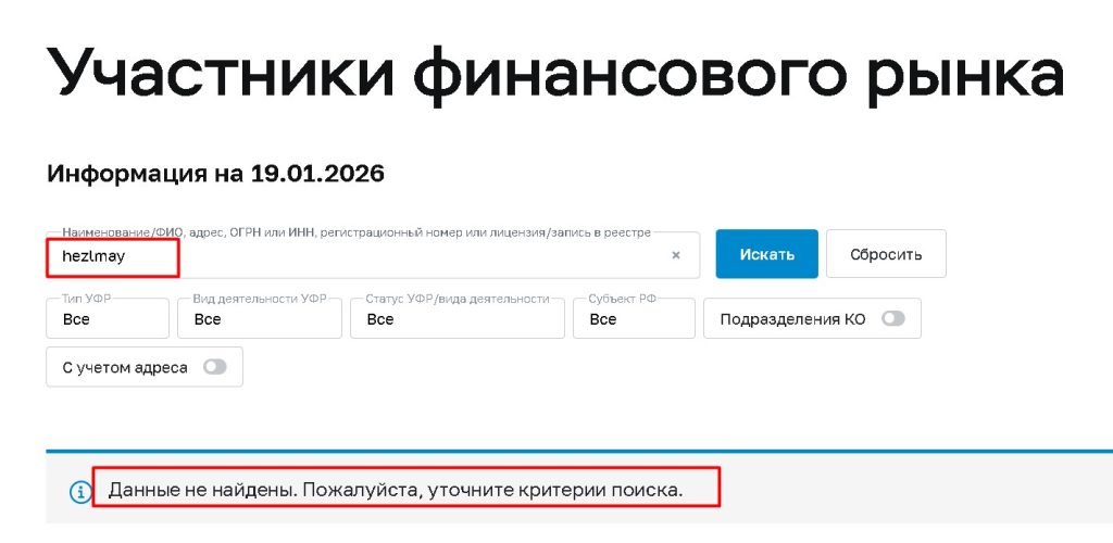ВЫВОД: Hezlmay — это классический, серийный мошеннический проект, созданный по шаблону, который повторяется десятки раз. Поддельные лицензии, фейковый адрес, отсутствие реального регулирования и поток жалоб от пострадавших не оставляют сомнений в его истинной природе. Единственный способ не потерять деньги — не вступать с ними ни в какие контакты. Настоящий брокер всегда имеет проверяемую лицензию авторитетного регулятора, прозрачные условия и никогда не требует дополнительных платежей для вывода ваших собственных средств.