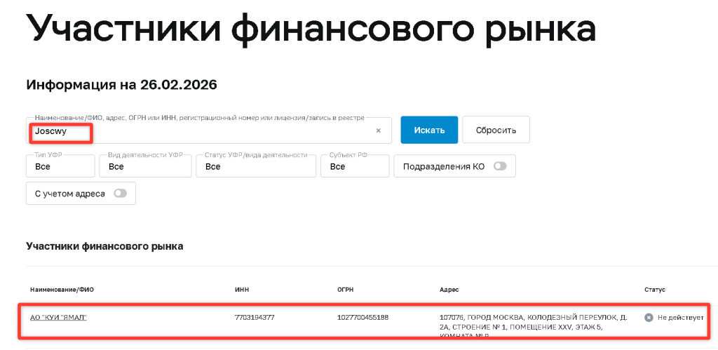 joscwy.com. - Если домену меньше 1 года (особенно если меньше 6 месяцев), а сайт предлагает финансовые услуги — это 100% мошенники. Легальные брокеры не открываются на «свежих» доменах.