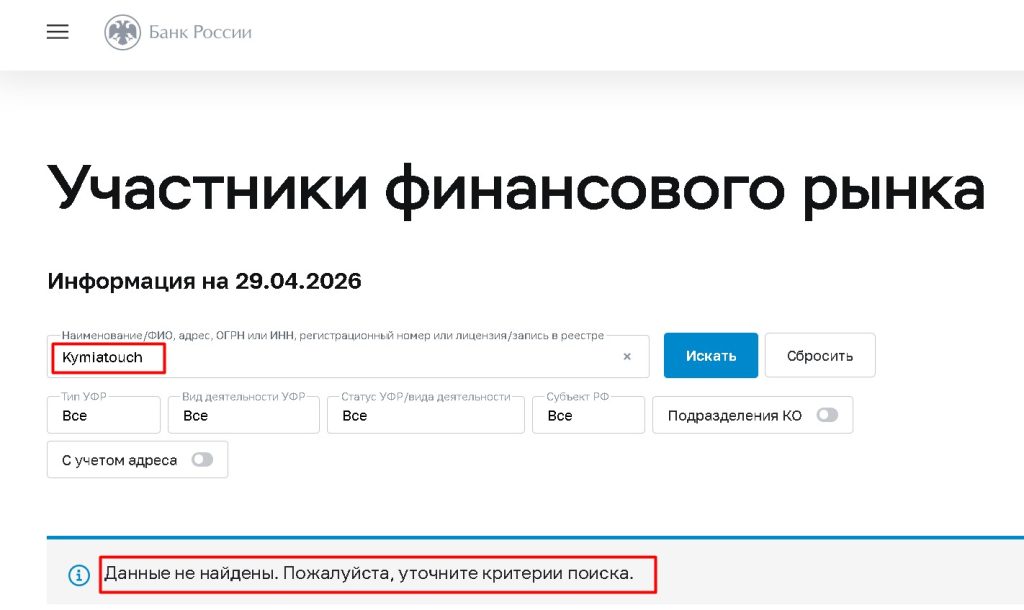 У Kymiatouch нет лицензии Центробанка России, нет и от зарубежных финансовых регуляторов (FCA, CySEC, SEC). Лицензия подтверждает законность работы компании и защищает интересы трейдеров. Без лицензии деньги клиентов не защищены.