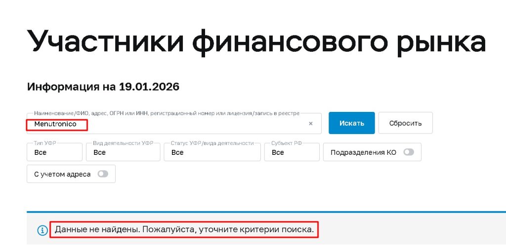 ВЫВОД: Menutronico — штампованный мошеннический проект, созданный по шаблону десятков аналогичных схем. Его судьба предсказуема: блокировка вывода, вымогательство и исчезновение. Единственный способ защитить свои средства — не вступать с ними ни в какие контакты. Настоящий брокер всегда имеет проверяемую лицензию авторитетного регулятора (FCA, CySEC, ЦБ РФ) и никогда не требует дополнительных платежей для вывода ваших денег.