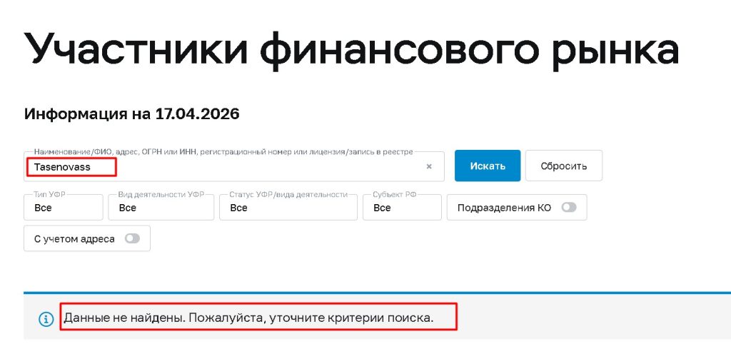 У Tasenovass нет лицензии Центробанка России, нет и от зарубежных финансовых регуляторов . Лицензия подтверждает законность работы компании и защищает интересы трейдеров. Без лицензии деньги клиентов не защищены.