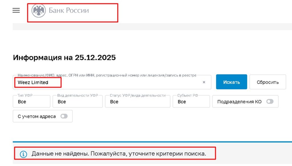 | Отсутствие лицензии ЦБ РФ | Критически важный момент для российских инвесторов: Weez Limited не внесена в реестр Банка России. Работа с этой компанией нелегальна, а клиенты лишены правовой защиты в РФ. |